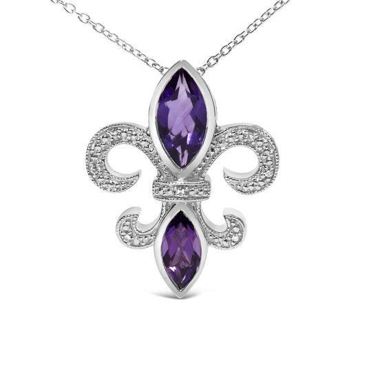 .925 Sterling Silver Purple Amethyst Marquise and Diamond Accent Fleur De Lis Pendant Necklace (H-I Color, SI1-SI2 Clarity) - Size 18"