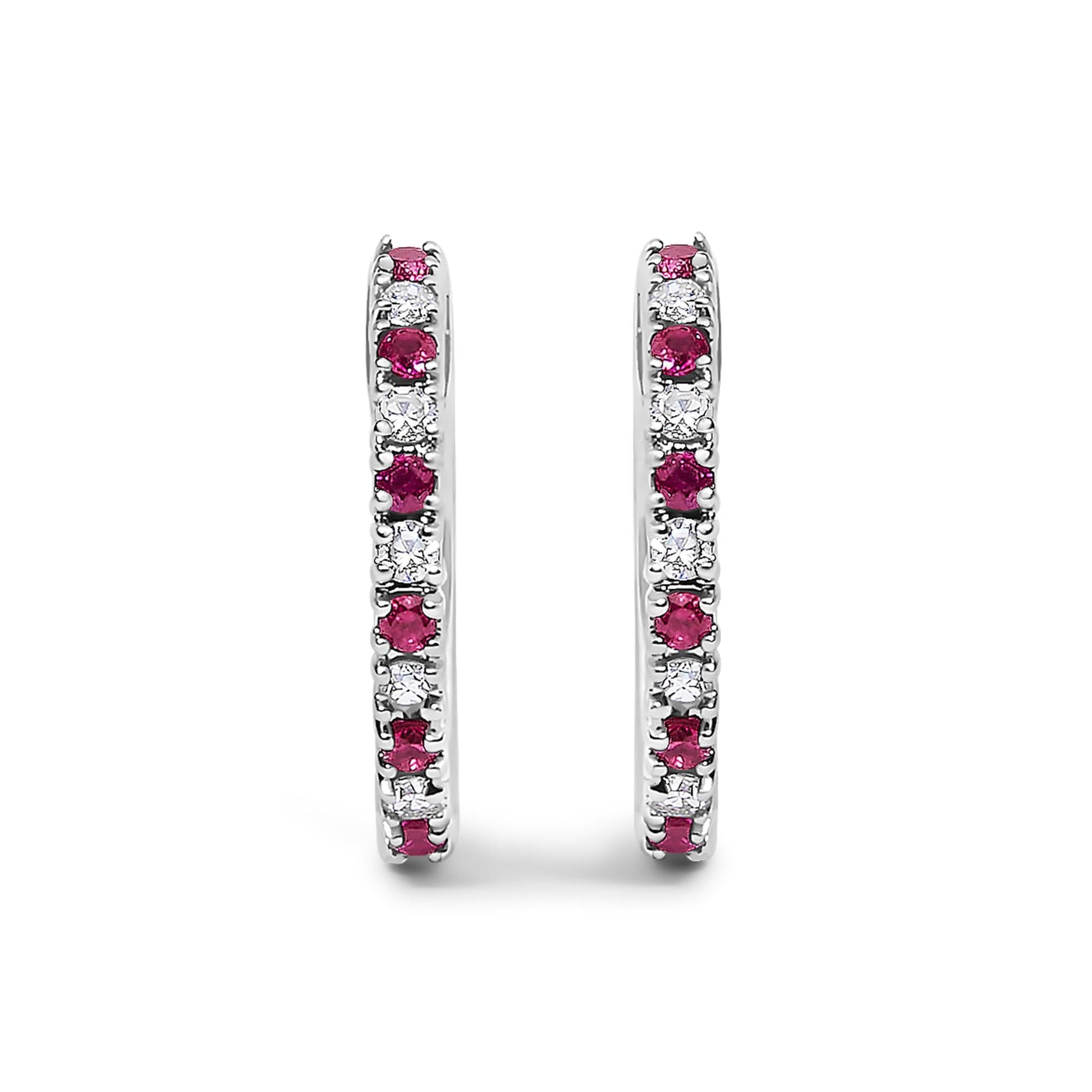 Captivate the senses with these exquisite 10K white gold earrings, where each piece delicately balances the scintillating brilliance of natural white diamonds against the deep, passionate hues of round, prong-set natural rubies. Secured with a hinge back for comfort, these Huggy Hoop earrings are a symphony of elegance and vibrancy. The alternating gemstones are masterfully set along a sleek, single row, creating a mesmerizing trail of color and sparkle that dances in harmonious contrast. The diamonds, with their I-J color and I1-I2 clarity, twinkle with an innate fire, while the heat-treated rubies deepen the visual allure, each gem measuring a precise 1.4x1.4mm. This pair promises not only to add a touch of luxury to every ensemble but to become a cherished keepsake in any jewelry collection. White gold is rhodium plated.