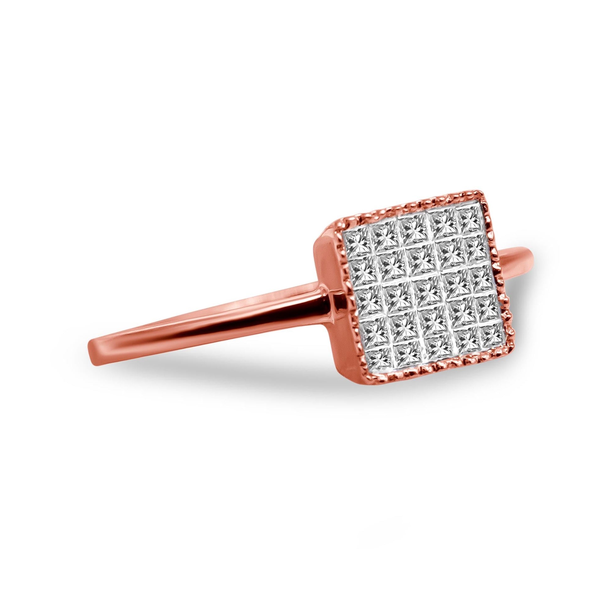 Add shimmer to any look with this eye-catching diamond ring. Fashioned in rich 10K rose gold, this striking style showcases a square-shaped composite of petite princess-cut diamonds. The diamonds are invisibly set to minimize metal and maximize diamond sparkle! A border of intricate milgrain adds subtle heirloom appeal while the inside of the shank is rounded for all-day comfort. Captivating with 1/3 ct. t.w. of diamonds and a bright polished shine, this ring fits any occasion with ease.