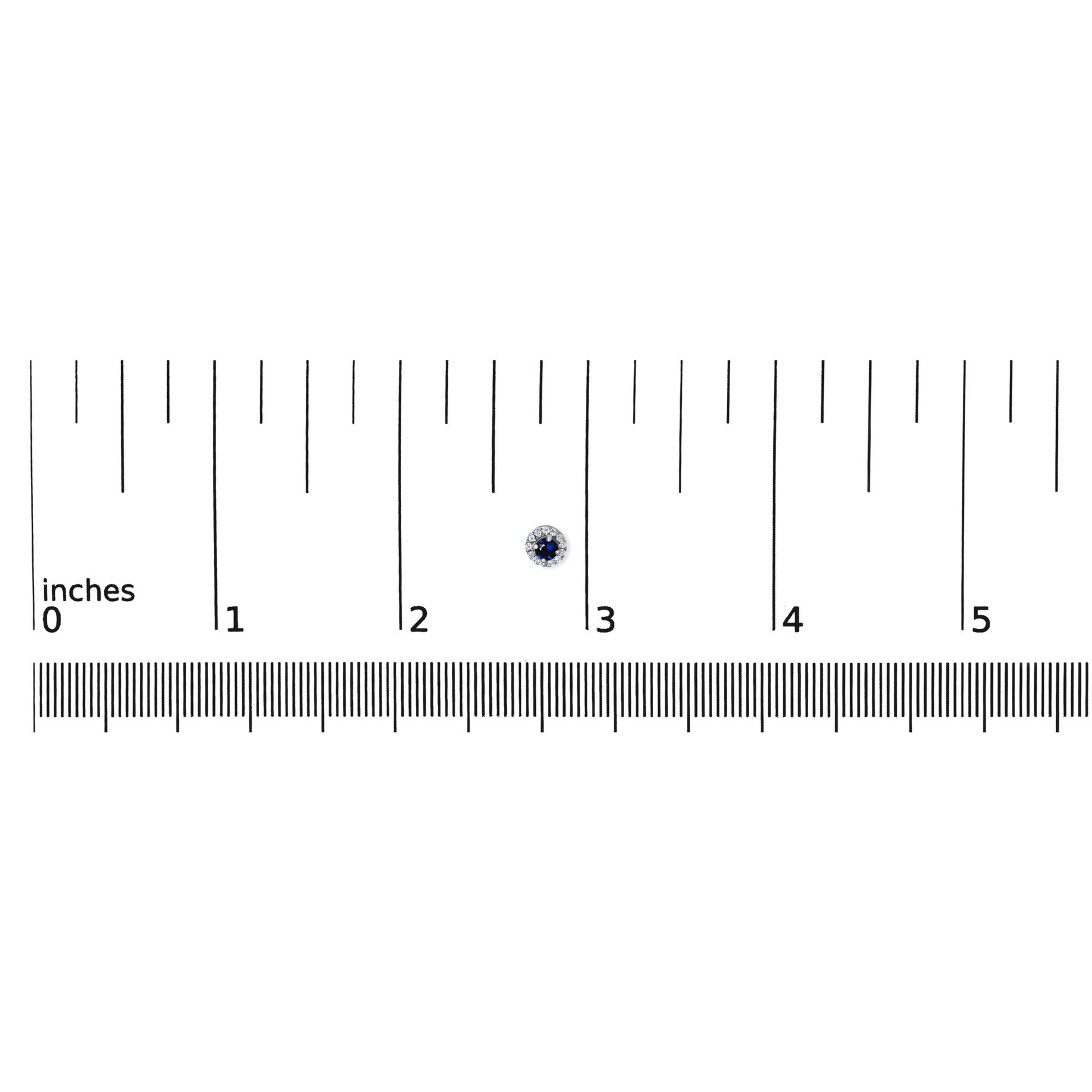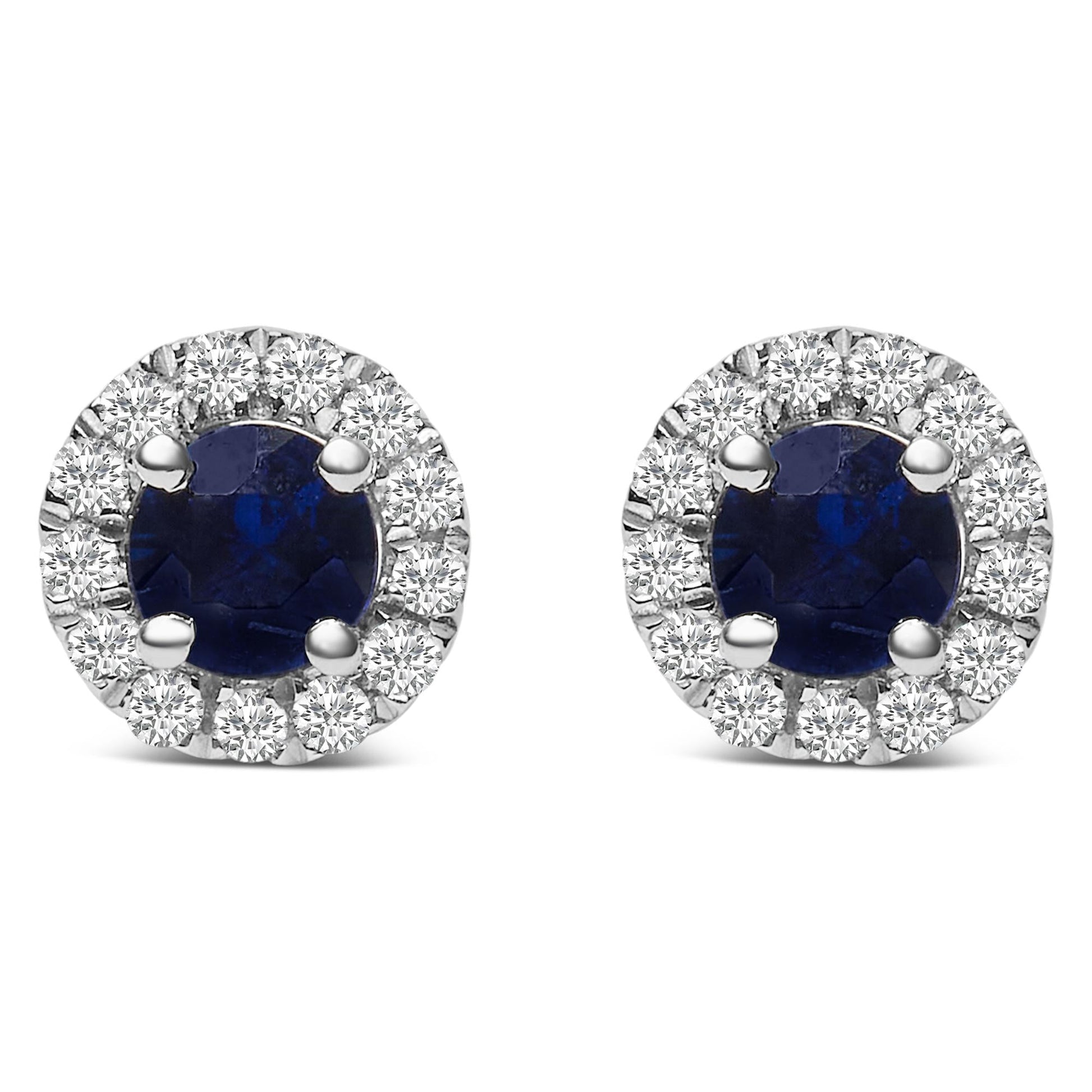 Indulge in the symphony of light and color with these exquisite 10K white gold earrings, beautifully highlighted by the natural allure of deep blue sapphires, naturally sourced, and meticulously crafted without any treatment, ensuring their pristine and authentic beauty shines through. Each earring centers a luscious 3.25mm blue sapphire, encircled by a radiant halo of natural diamonds, collectively weighing 1/10 carat, boasting an I-J color and I1-I2 clarity. This enchanting constellation is designed to mimic a grander solitaire, casting a spherical illusion that magnifies its mesmerizing impact. The durable rhodium plating enhances the white gold’s brilliance, ensuring lasting gleam and sophistication. Secure pushbacks provide peace of mind for these treasures of refined elegance, destined to elevate any ensemble, captivate onlookers, and resonate with the wearer's refined taste.