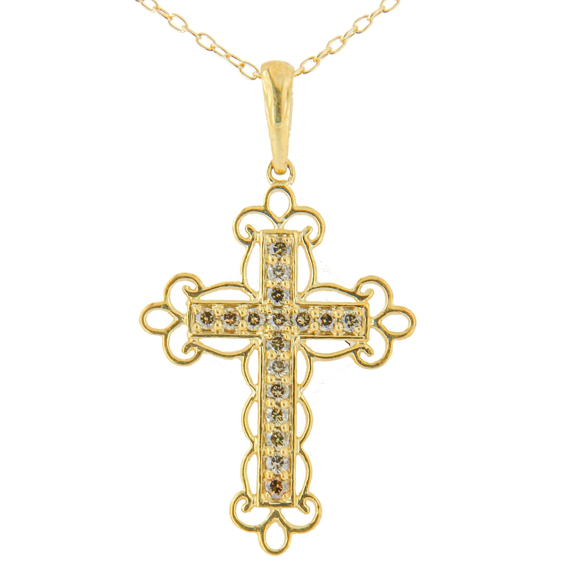 10K Yellow Flashed .925 Sterling Silver 1/4 Cttw Champagne Diamond Filigree Cross Pendant Necklace (K-L Color, I1-I2 Clarity) - 18"