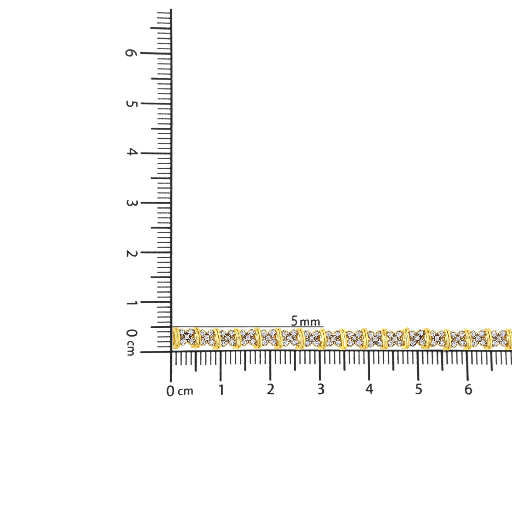 Treat yourself to this glamorous cluster bracelet created in the sparkling 10k yellow gold plated .925 sterling silver. This piece shines with "X" clusters set with round-cut diamonds, separated by yellow gold links. This beautiful bracelet has a total diamond weight of 2 cttw which makes it the perfect accessory to dress up any attire. Pair it with an elegant outfit for a night out and get dazzled with compliments.