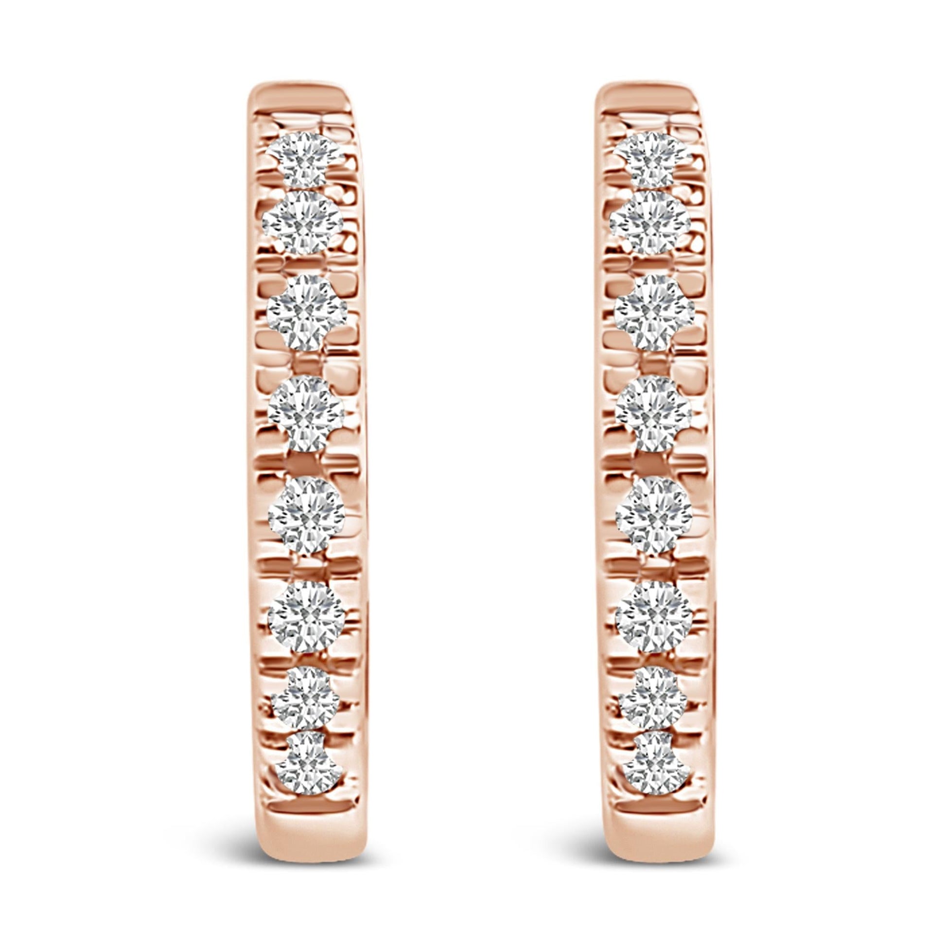 Immerse yourself in the understated elegance of these 14K Rose Gold huggie hoop earrings, each piece glistening with natural diamonds that catch the light with every turn. Designed to embrace the earlobe with a sleek, refined profile, they provide a comfortable, secure fit for daily wear. Whether elevating a minimalist look or adding a refined accent to an evening outfit, these earrings deliver a timeless balance of sparkle and sophistication—an effortless essential you’ll reach for again and again. Their enduring design and luminous 1/5 CTW diamond accents reflect the lasting beauty and sentiment that treasured heirlooms provide, making them not just jewelry, but heirlooms.