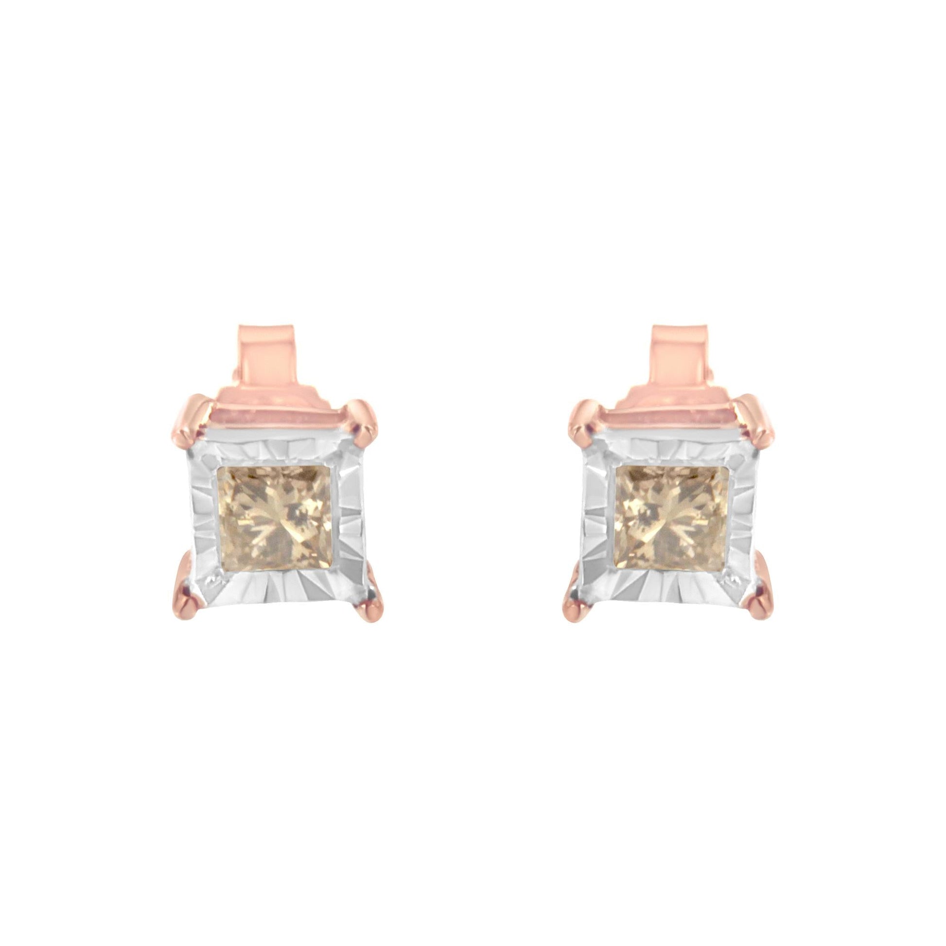 14K Rose Gold Plated Two-Tone .925 Sterling Silver 1/2 Cttw Princess-Cut Square Diamond Solitaire Miracle-Plate Stud Earrings (K-L Color, I2-I3 Clarity)