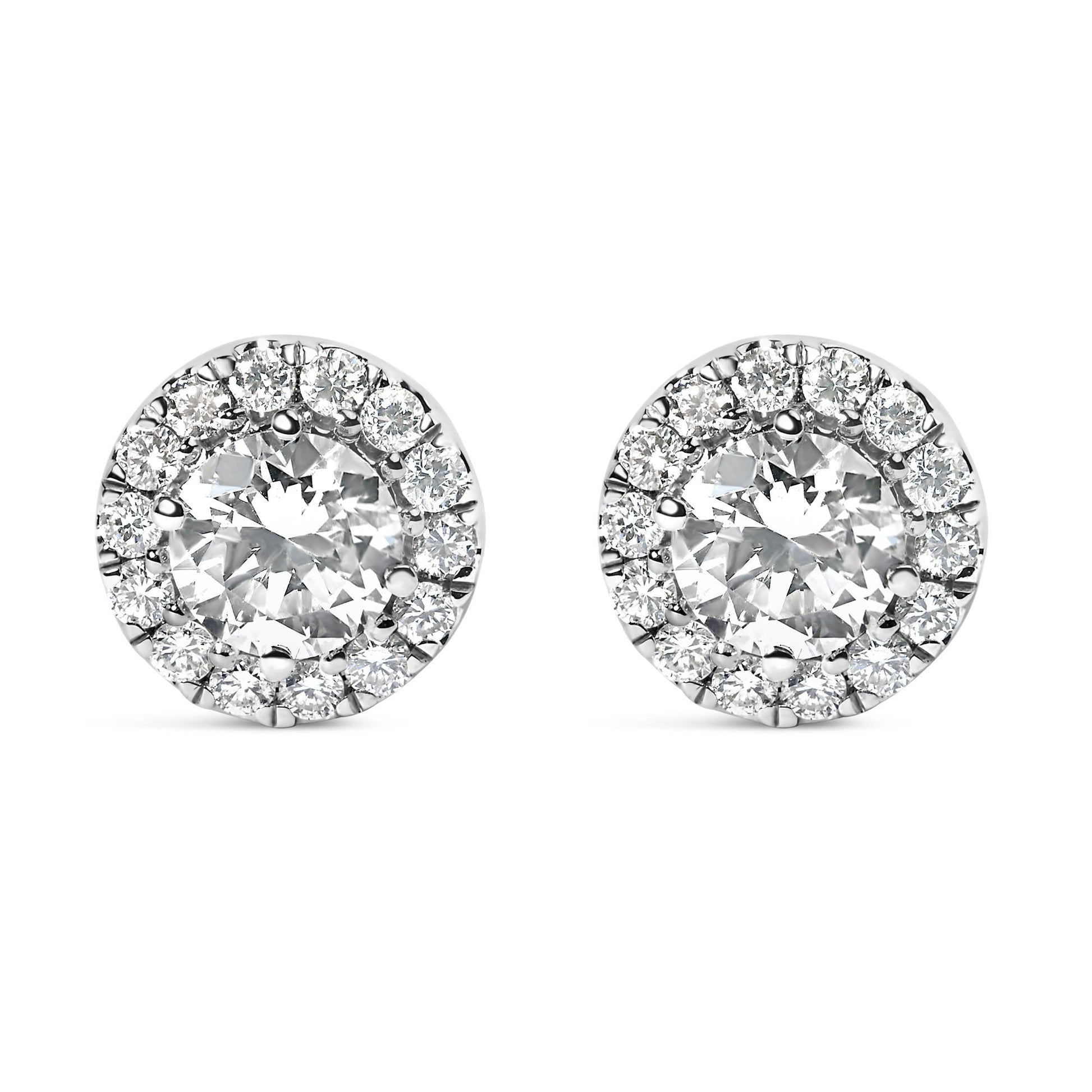 Unveil timeless elegance with these exquisite 14K white gold stud earrings, each adorned with a mesmerizing 1.0 carat lab-grown diamond halo that dances with light. Crafted with precision, the central F-G color, VS2-Si1 clarity diamonds glisten intensely, encircled by a constellation of scintillating smaller diamonds, ensuring a radiant glow from every angle. The secure prong settings and screw-back closures promise both comfort and safety, making these jewels not only a statement of luxurious style but also a testament to thoughtful craftsmanship. Ideal for celebrating life's most treasured moments, these earrings encapsulate the harmony between modern ethical sourcing and classic aesthetic appeal, offering an enduring sparkle meant to be cherished forever. Earrings have 1/3 cttw center stones.