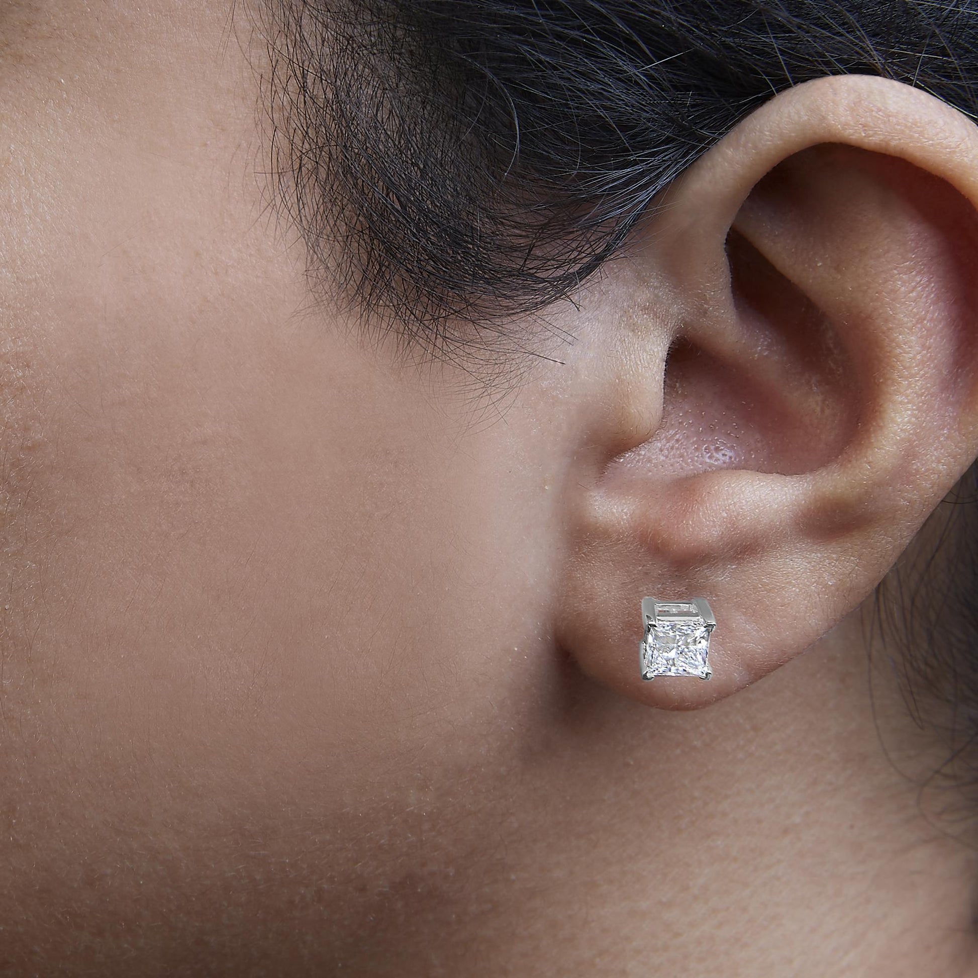 Embrace timeless elegance and modern sophistication with these exquisite 14K white gold solitaire stud earrings. Each earring is meticulously crafted to showcase a dazzling 1/2 carat lab-grown princess cut diamond, offering a total carat weight of 1 for the pair. These stunning gems are celebrated for their F-G color and VS2-SI1 clarity, ensuring a brilliant sparkle that captures the essence of luxury. Expertly set in a secure four-prong setting, these diamonds reflect the pinnacle of craftsmanship and design. The earrings are further enhanced by a rhodium plating over the white gold, giving them a luminous, high-polish finish that accentuates their beauty. Designed for those who appreciate the marriage of innovation and tradition, the earrings come equipped with screw backs to ensure a secure and comfortable fit. Perfect for every occasion, from daily wear to the most glamorous events, these earrings promise to be a cherished addition to any jewelry collection, embodying both the allure of diamonds and the prestige of fine jewelry.