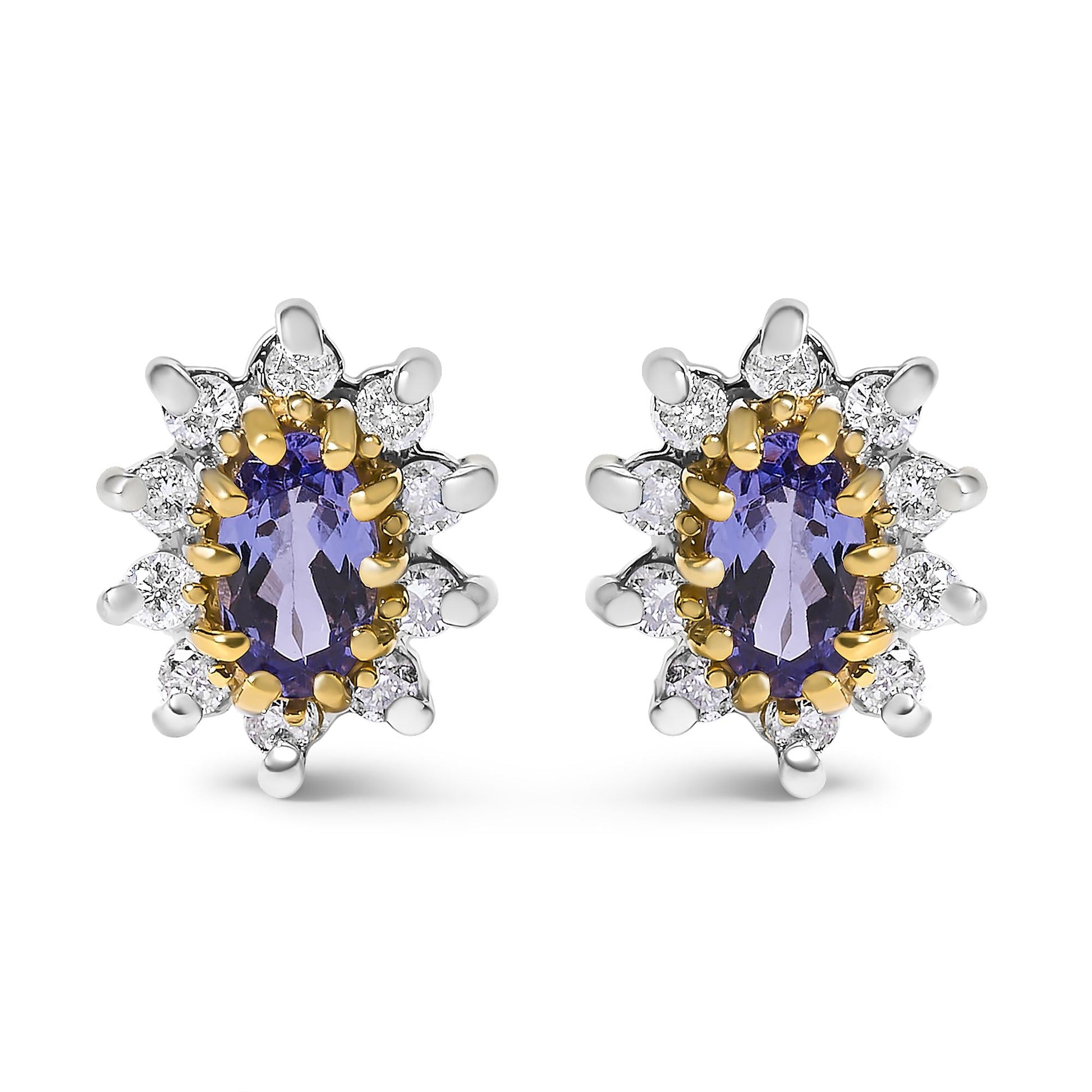 Discover the celestial charm cast by these exquisite stud earrings, each hosting an enchanting, oval-cut blue-purple Tanzanite, naturally sourced and heat-treated to enhance its mystical hues. Measuring 5x3 mm, these gemstones sit at the heart of a brilliant sunburst halo composed of scintillating natural diamonds, totaling a quarter carat. Crafted in lustrous 14K yellow gold and accented with rhodium-plated elements, the design achieves a stunning blend of warmth and radiance. These treasures secure effortlessly with push-back closures, promising both comfort and style. Perfect for everyday elegance or special soirees, these earrings illuminate any ensemble with a touch of the cosmos.
