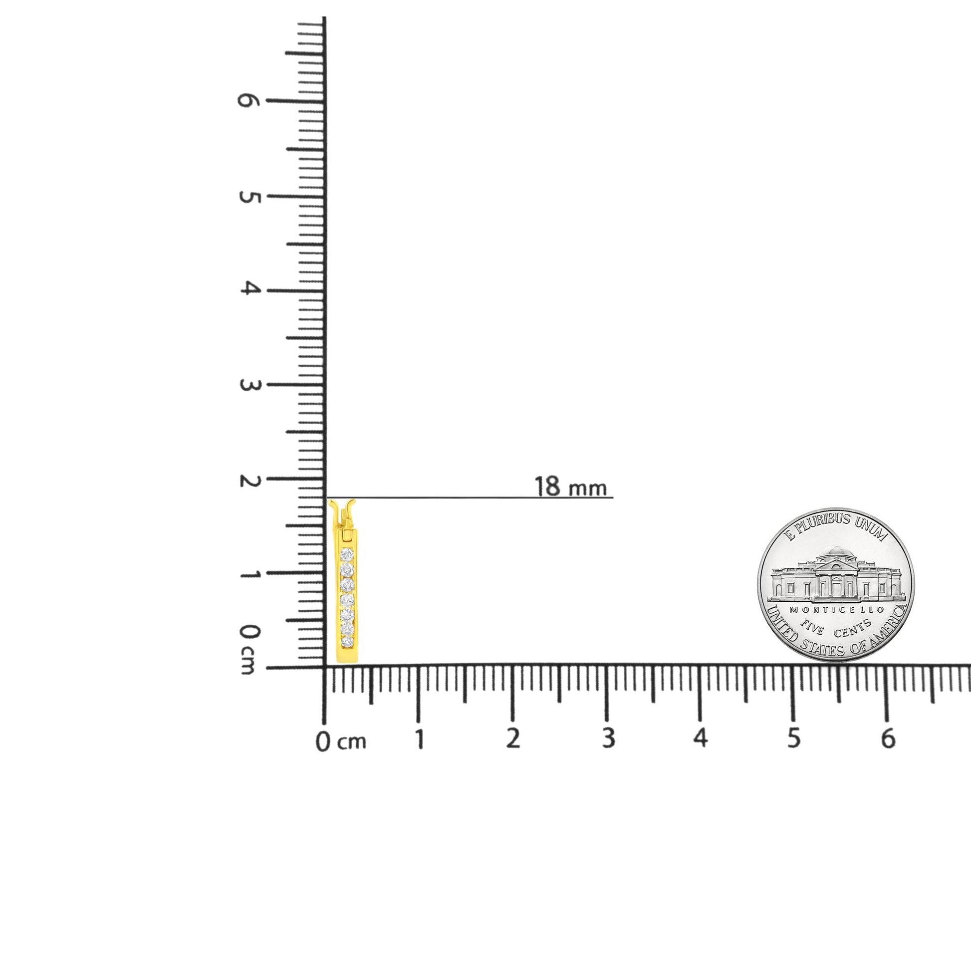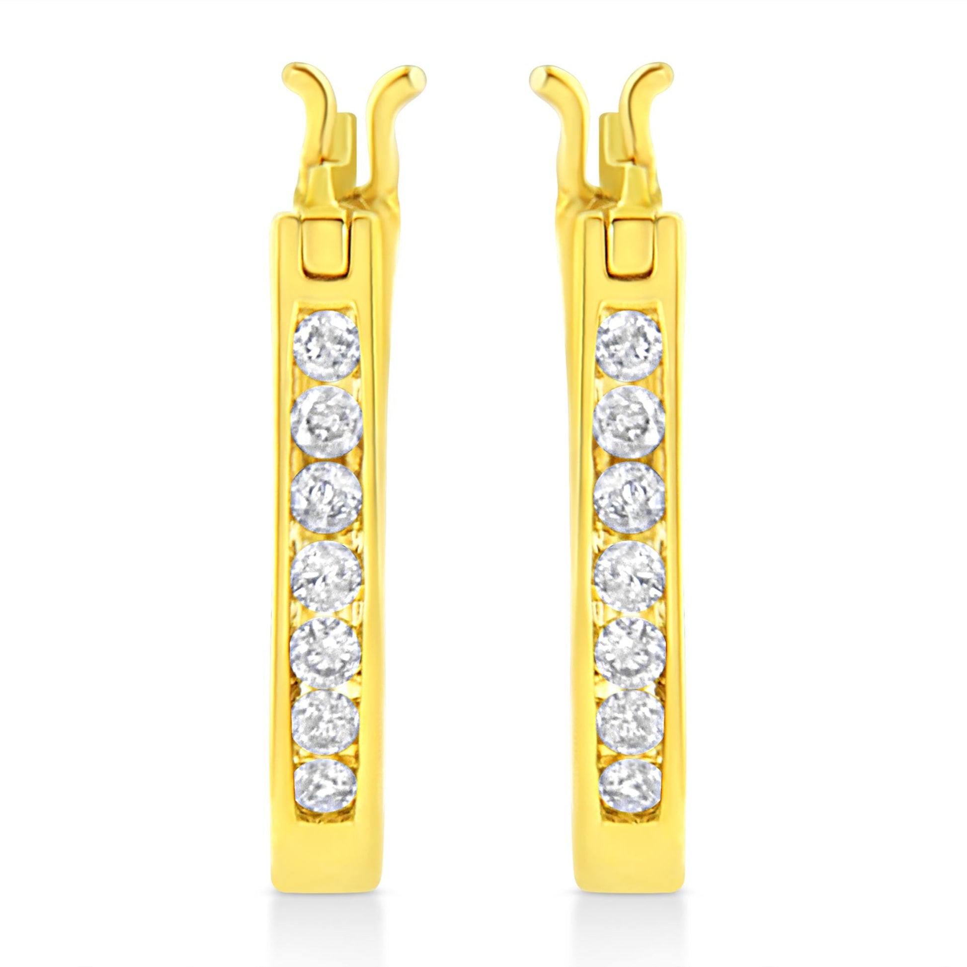The power of diamonds is truly transformative! Our secret to great style is in classic accessories like this pair of 1/4 ct. t.w. round brilliant-cut diamond hoops. The sparkling gemstones shine in their elegant channel setting. Crafted 14k Yellow Gold Plated .925 Sterling Silver with a high quality polished finish. Hanging length is 3/4". Leverback posts provided added security so you can rest easy knowing that your earrings are secure on your ears..