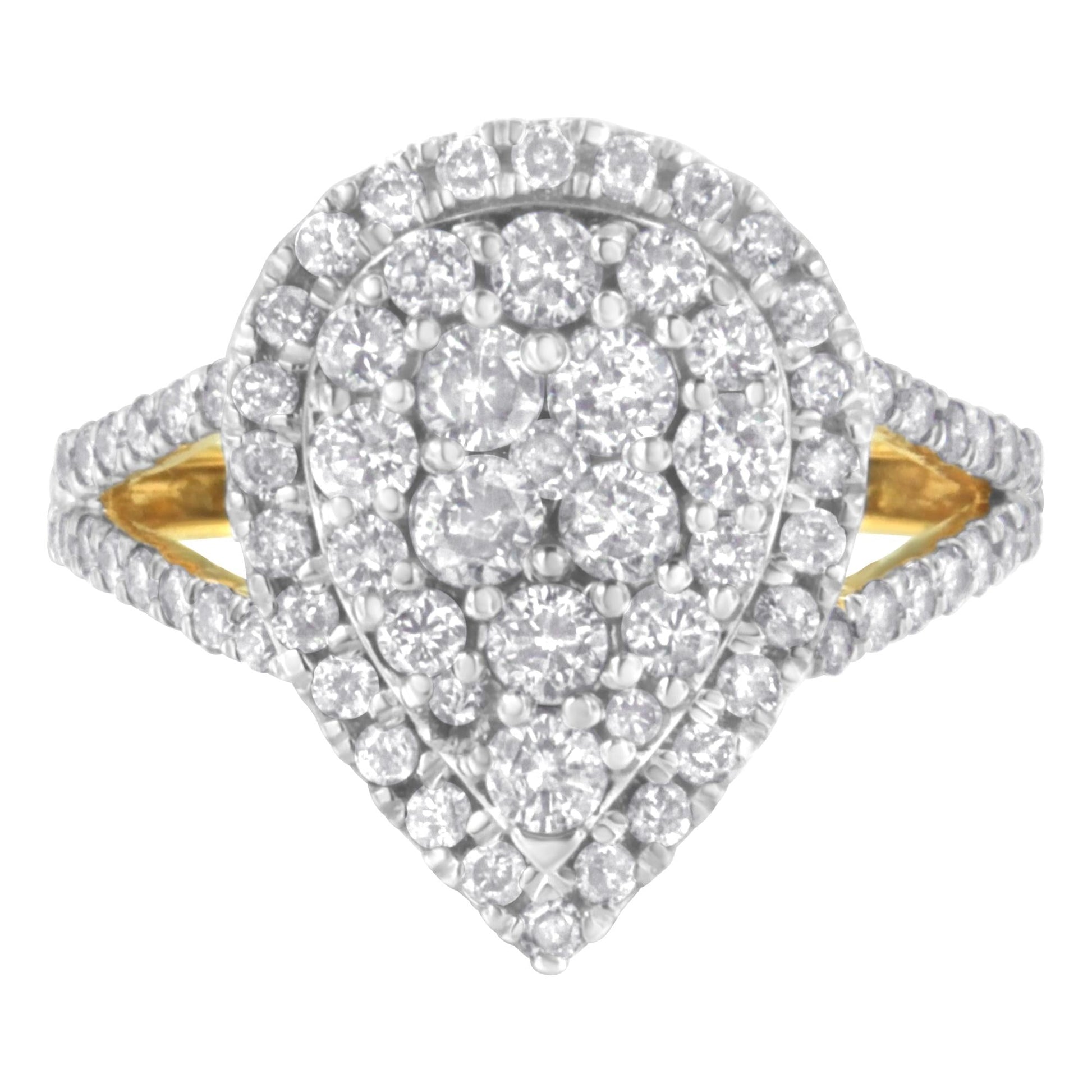 A bold silver and diamond cluster ring. This pear-shaped ring is made with 80 round-cut diamonds in a prong setting, weighing a total of 1 1/2 ct. The diamonds are set in yellow-plated sterling silver.