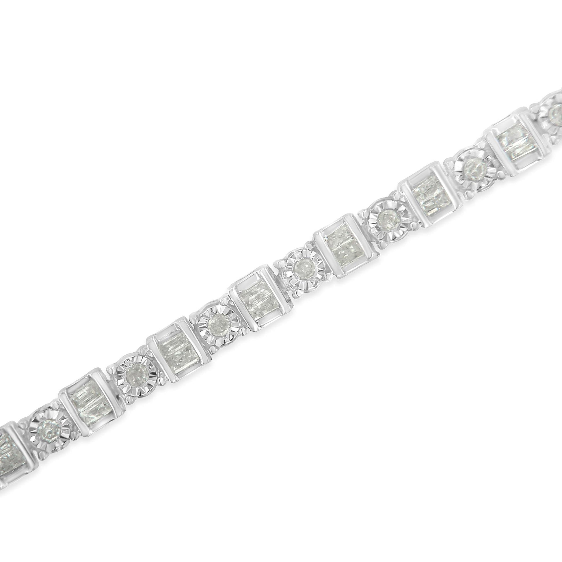 Elegant and timeless, this gorgeous sterling silver alternating station tennis bracelet features 1.0 carat total weight of round and baguette cut diamonds with a whopping 99 stones in all. The tennis bracelet features alternating round and square links with each round link adorned with a round stone in an illusion setting, and each square link adorned with baguette cut diamonds. The round stones are set in our unique miracle-plate setting, which centers each genuine diamond in a mirror-finish, high-polish frame that gives the illusion of a much larger stone. The 7†bracelet culminates in a box with tongue and safety clasp. This authentic design is crafted of real 92.5% sterling silver that has been electro-coated with genuine rhodium (a platinum-family metal), ensuring it will keep a tarnish-free shine for years to come. This classic tennis bracelet makes a great gift for any occasion! Give her a gift that will perfectly complement her favorite ensemble.