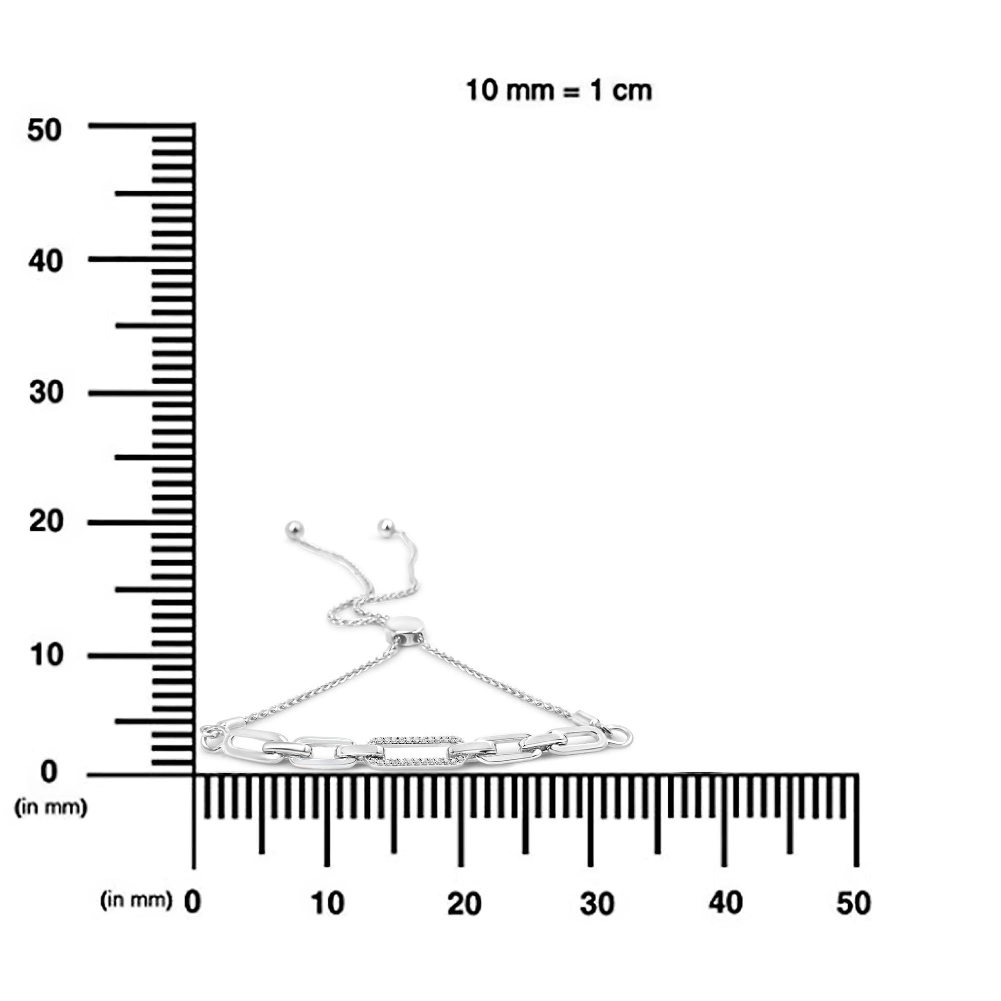 Delicately crafted from high-quality .925 sterling silver, this exquisite bracelet embodies modern sophistication intertwined with a hint of timeless charm. Its sterling brilliance, enhanced with rhodium plating, ensures a radiant glow that complegrades with the wearer's every movement. Central to its uniquely alluring design is the innovative paperclip link, embellished naturally with diamonds totaling 1/10 carats. These precious stones catch the light with their I-J color and I2-I3 clarity, infusing every gesture with a sparkle synonymous with elegance. The adjustable bolo closure, refined with dainty spherical beads, is both practical and stylish, offering a customizable fit for wrist sizes from 4 to 10 inches. This piece is not just jewelry; it's a versatile companion, perfect for upscale events or adding a touch of glamour to your everyday ensemble.