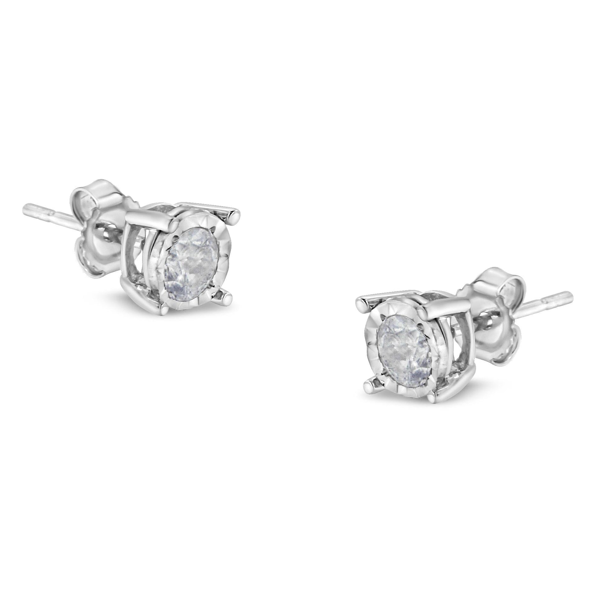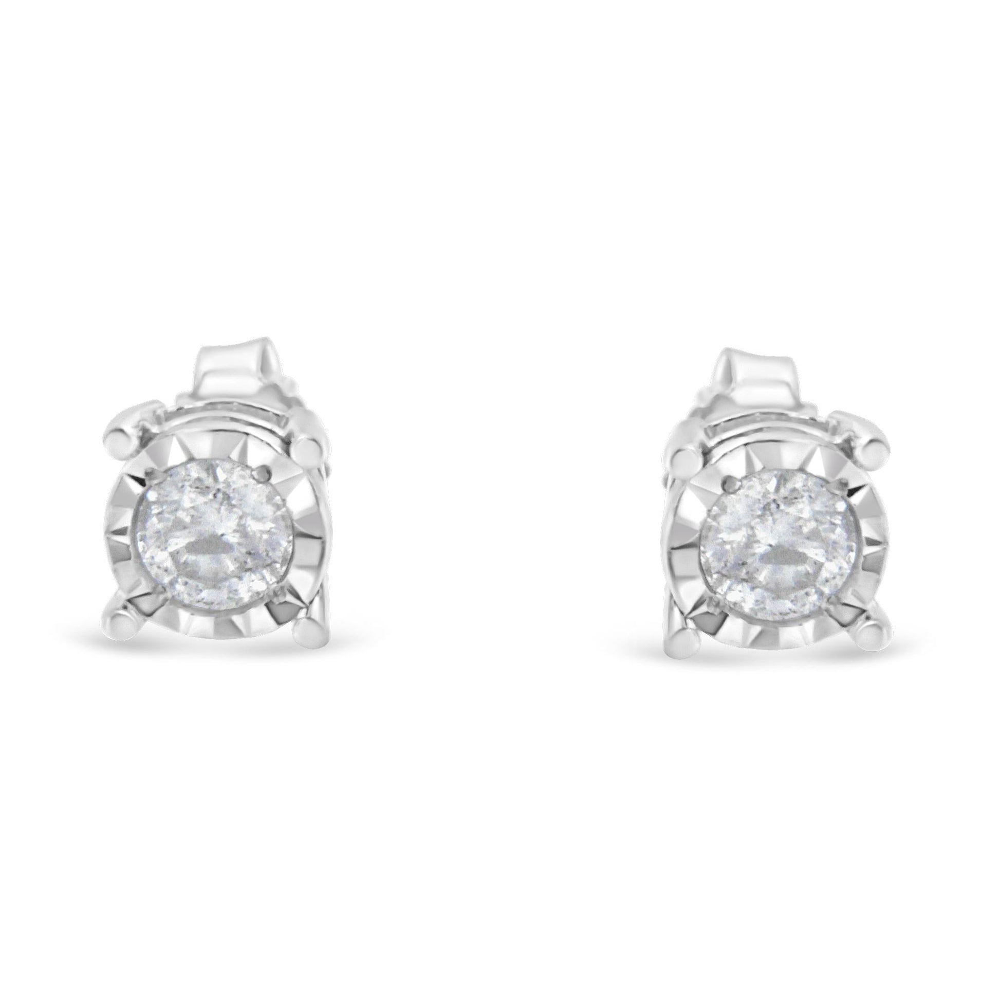 Celebrate any occasion with these classic shimmering diamond stud earrings. Fashioned in .925 sterling silver, each earring showcases a sparkling ¼ carat round, brilliant cut, miracle-set diamond solitaire. The unique miracle-plate setting centers each genuine diamond in a mirror-finish, high-polish frame, giving the illusion of a much larger stone. Dazzling with a bright polished shine, these post earrings secure comfortably with friction posts and butterfly backs. This authentic design is crafted of real 92.5% sterling silver that has been electro-coated with genuine rhodium (a platinum-family metal), a precious metal that will keep a tarnish-free shine for years to come. These classic earrings make a great gift for any special occasion! Whether worn for daytime glamour or evening sparkle, these studs are gorgeously versatile. Coordinate these earrings with your favorite diamond necklace or other diamond jewelry to create a complete elegant ensemble.