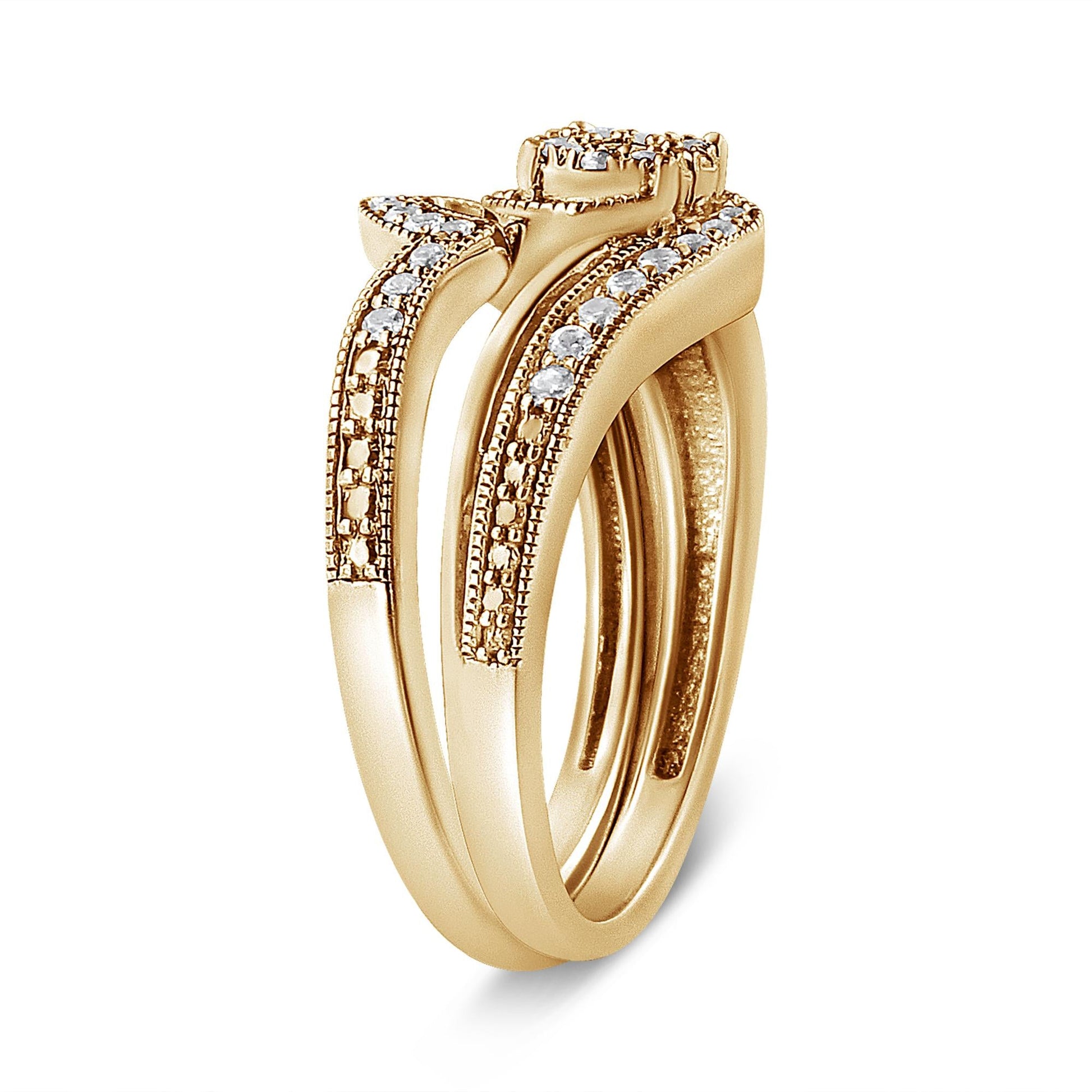 Introducing a timeless treasure, this vintage-style bridal set ring and band exudes elegance and sophistication. Crafted with 14K yellow gold plated .925 sterling silver, it showcases a dazzling array of 39 natural round diamonds. With a total weight of 1/3 cttw, these diamonds sparkle brilliantly, set in a prong setting to enhance their beauty. The bypass design adds a unique touch, symbolizing the intertwining of two souls. Perfect for engagements, this set is designed for women who appreciate classic beauty and want to make a statement. The I-J color of the diamonds adds a touch of warmth, while the I3 clarity ensures a mesmerizing shine. This exquisite set will capture hearts and create unforgettable moments.
