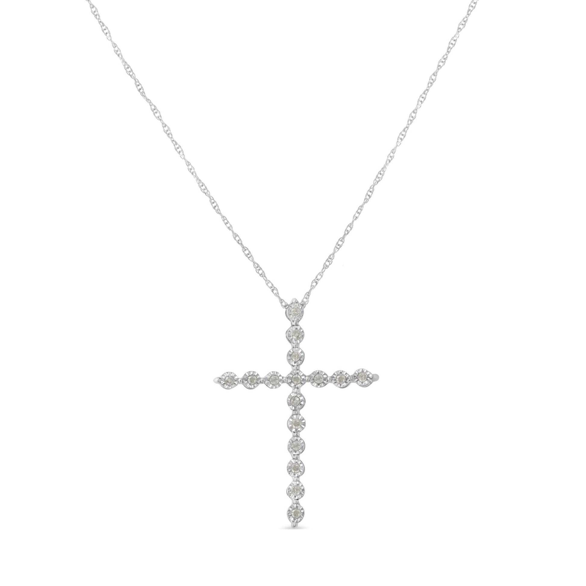 This beautiful piece of jewelry is not only a symbol of devotion and faith but also a true work of art. This gorgeous .925 sterling silver pendant necklace features sixteen round, rose cut, promo quality diamonds in a cross design. Each diamond is set in our unique miracle-plate setting, which centers each genuine diamond in a mirror-finish, high-polish frame, giving the illusion of a much larger stone. Each diamond in its faceted bezel frame is stacked in a cross shape. Rose-cut, promo quality diamonds are milky and cloudy in nature. This diamond pendant comes with a contemporary yet classic 18†rope chain that complements any neckline beautifully. It has a spring ring clasp. This authentic design is crafted of real 92.5% sterling silver that has been electro-coated with genuine rhodium (a platinum-family metal), ensuring it will keep a tarnish-free shine for years to come. Whether worn for daytime glamour or evening sparkle, this necklace is gorgeously versatile.
