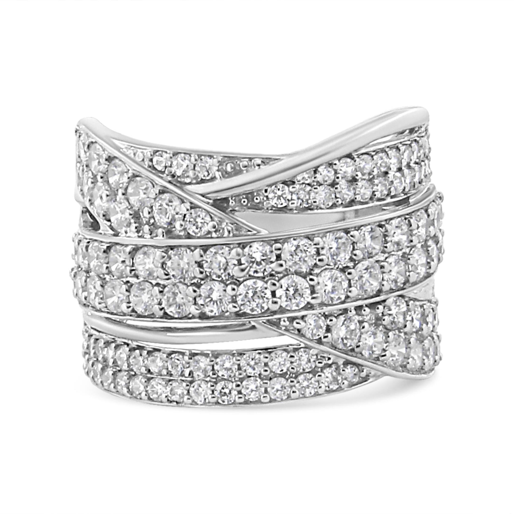 Bold and striking, this glamorous diamond band is crafted from genuine .925 sterling silver, a metal that will stay tarnish free for years to come. Boasting an impressive total carat weight of 2.00 c.t., this ring has bypass, overlapping design embellished with sparkling round-cut diamonds in a classic prong setting. This ring will shine bright on your finger and add a touch of magnificence to your look!