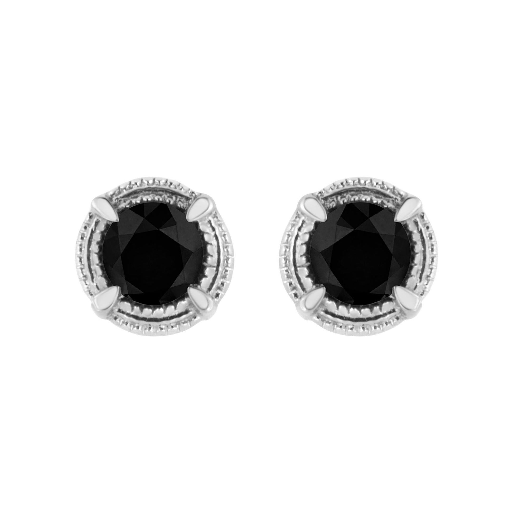 Add this stunningly unique diamond stud earrings to your jewelry collection and impress all your girlfriends. This beautiful pair of studs are made from the finest .925 sterling silver, and is embellished with treated, black round-cut diamonds in a prong setting. The total diamond weight is 2 cttw, and is sure to dress up any outfit of yours. Wear this to a black tie event or a casual dinner out and enjoy the glamour it provides. Comes with a screw on mechanism for a more secure fit. Each diamond weighs approximately 1 carats.