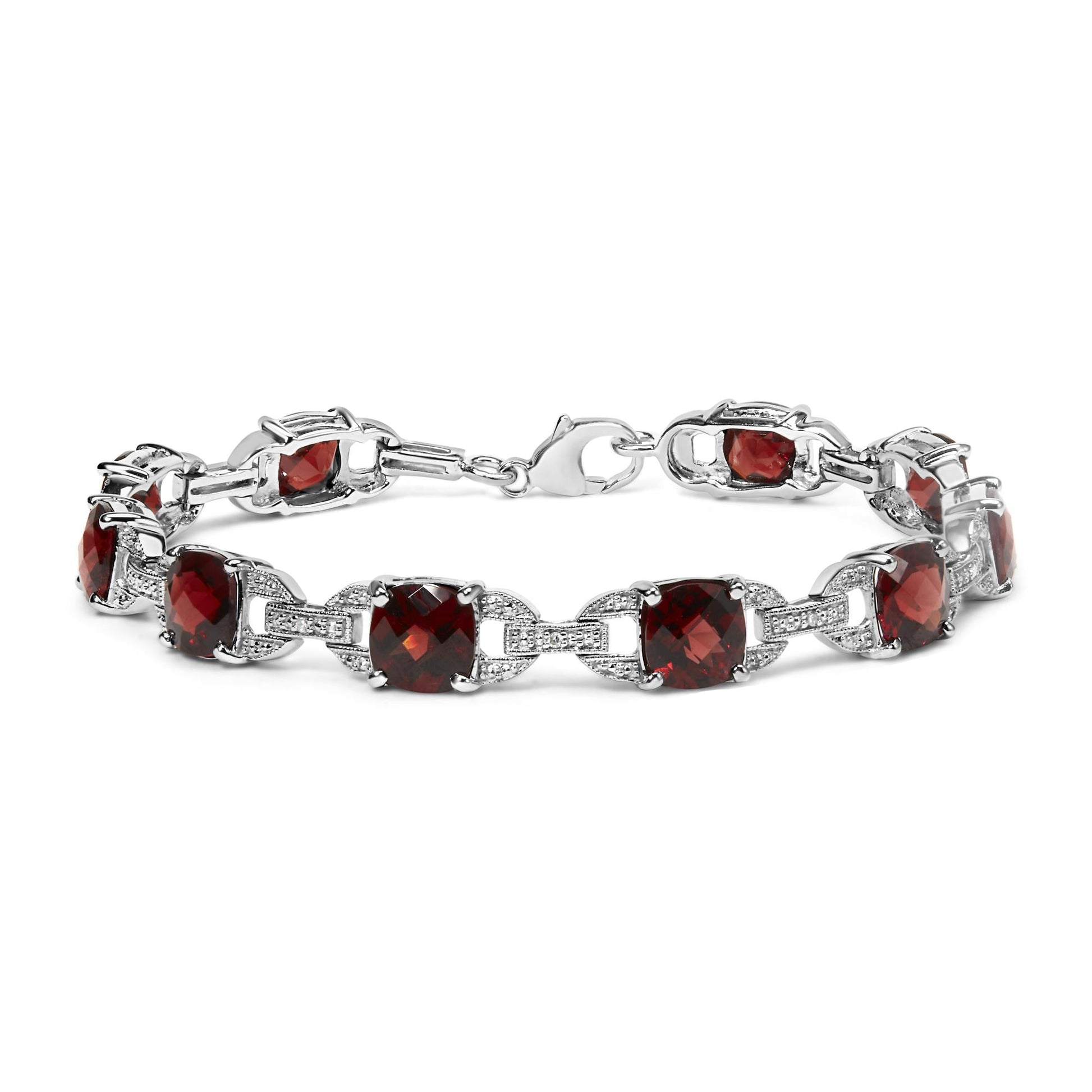 Indulge in the exquisite allure of this captivating .925 Sterling Silver Checkered Cushion Red Garnet and Diamond Accent Fashion Tennis Link Bracelet. Crafted with meticulous artistry, this stunning bracelet features a dazzling array of 10 natural diamonds, elegantly encased in a prong setting. The brilliant red cushion-cut garnet gemstones, measuring 7x7mm, are a true testament to timeless beauty. This bracelet exudes a radiant glow, complemented by the I-J color and I1-I2 clarity of the diamonds. The lobster claw clasp ensures a secure and comfortable fit, while the 7" inch size is perfect for women. Embrace the allure of this exquisite piece, a testament to your impeccable taste and style.