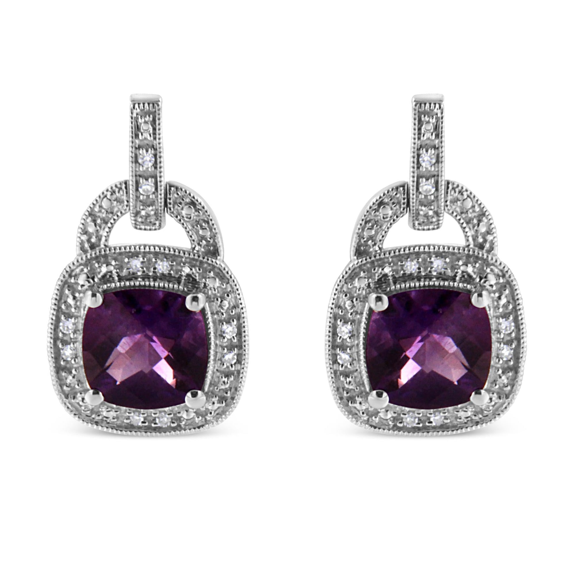 Beautifully express your love for her with these radiant amethyst and diamond earrings. Crafted in luminous sterling silver these earrings features 2 centrally staged 8MM cushion cut amethyst that are gracefully complemented by 20 sparkling single cut diamonds in pave setting. Total diamond weight is 1/10 ctw and each cushion cut amethyst measures 8x8mm.