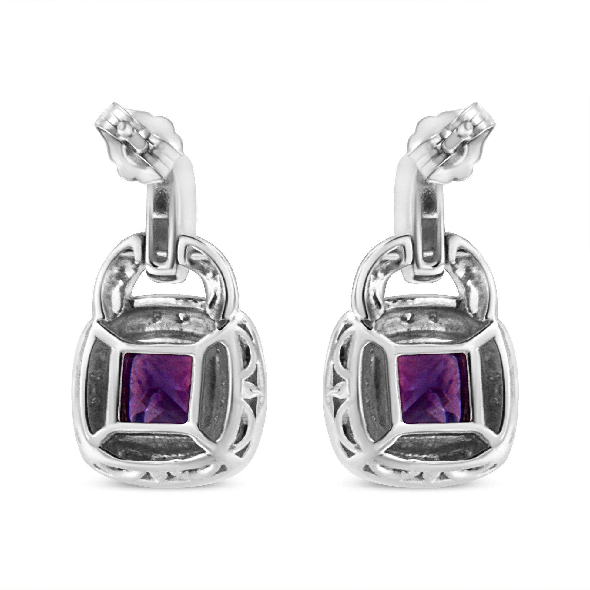 .925 Sterling Silver 8MM Natural Cushion Shaped Amethyst and Diamond Accent Halo with Push Back Dangle Earrings (I-J Color, I2-I3 Clarity)