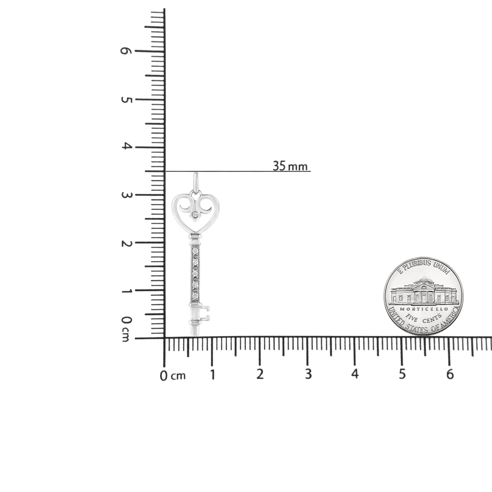 This sweet and romantic style diamond key pendant will brighten her smile. Crafted on sterling silver the heart-shaped bow of the key sparkles with a bezel set round cut diamond, while the stem and blade features 5 alluring prong set round cut diamonds. This pendant hangs from a cable chain. Total diamond weight is 1/20 ctw.