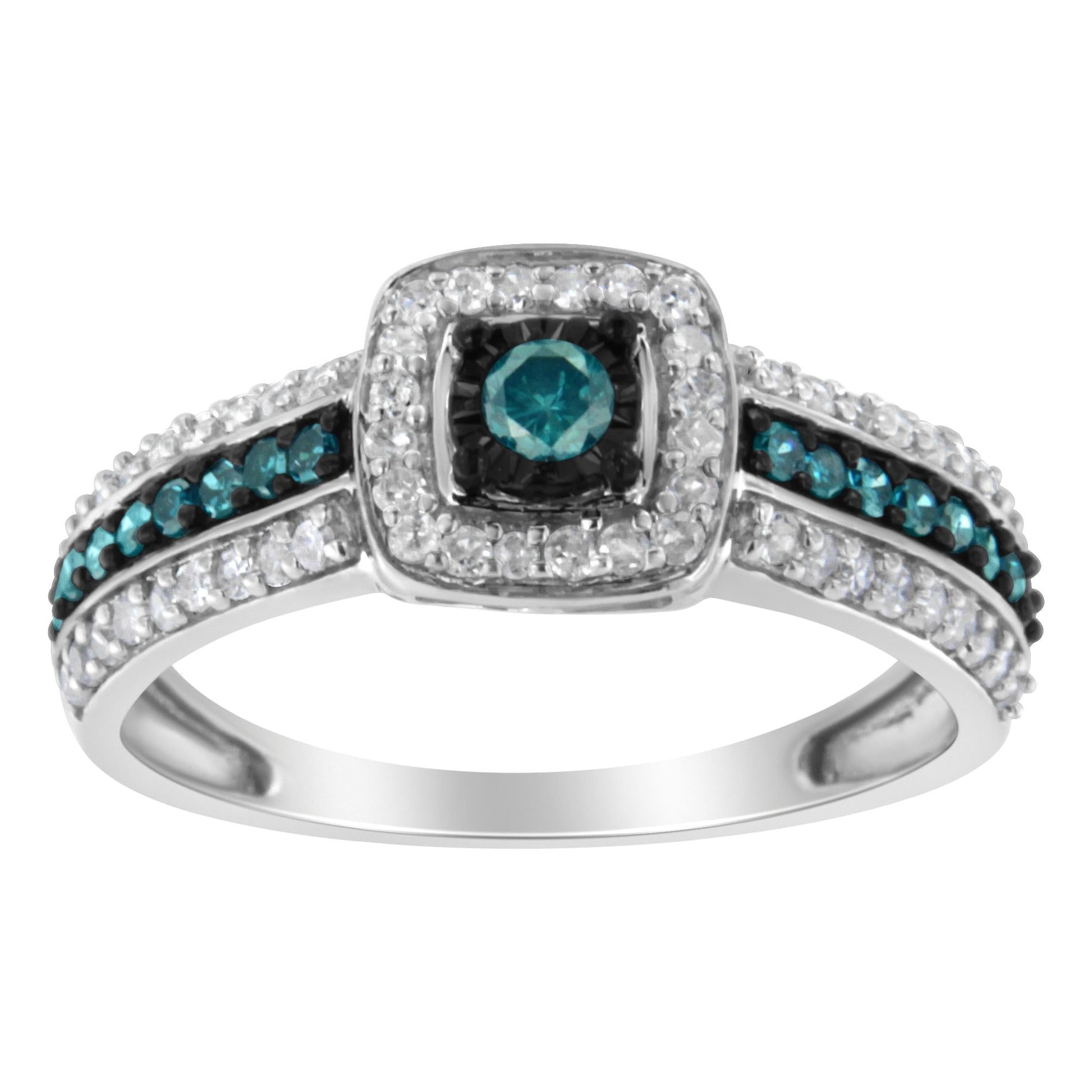 This unique ring features a treated blue diamond set within a halo of round white diamonds. The sterling silver band sparkles with a row of treated blue diamonds flanked on either side by white diamonds. It has a total diamond weight of .5 carats.