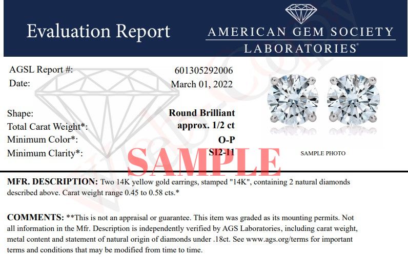 Celebrate any occasion with these classic shimmering diamond stud earrings. Crafted from 14k yellow gold each earring showcases a sparkling round-cut solitaire diamond in a 4-Prong Setting. Dazzling with 1/2 cttw of diamonds and a bright polished shine, these push back stud earrings secure comfortably on your ear. These diamond studs are certified by the AGS as natural, earth mined diamonds. These diamonds are color rated as O-P color, and clarity graded as SI2-I1 clarity. Make these classic diamond studs yours today!