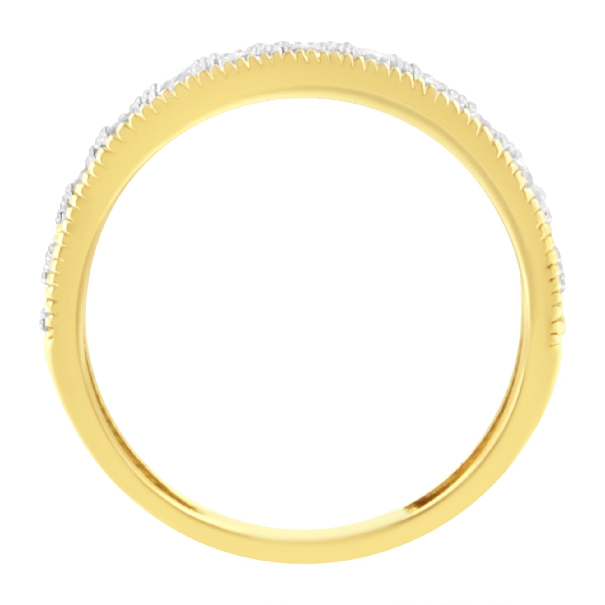 Elegant and timeless, this IGI certified 10K yellow gold diamond band features 0.5 carat total weight of round diamonds pave set into the face of the slender band. Each diamond is surrounded by multiple prongs which mimic the appearance of diamonds. The row of diamonds is centered between yellow gold beaded borders. The ring features 13 round, brilliant cut diamonds. The ring has a high shine, polished finish. This ring can serve as an engagement ring, wedding ring, anniversary band, or fashion statement. The sleek silhouette ensures that this band can stack with another ring. This authentic design is crafted of real 10 karat gold, a precious metal that will keep a tarnish-free shine for years to come. Whether worn for daytime glamour or evening sparkle, this modern band style ring is gorgeously versatile. Give her a gift that will perfectly complement her favorite ensemble.