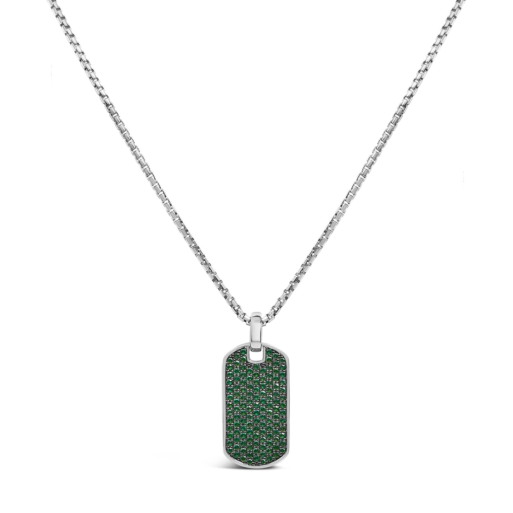 Unleash the essence of timeless elegance and bold modernity with this striking mens pendant necklace. Expertly crafted from .925 sterling silver, this piece glistens with a rhodium plating, ensuring durability and a luminous shine that captivates the eye. At its heart, the dog tag silhouette is intricately adorned with an array of lab-created green emeralds. These gemstones, treated with oil for enhanced clarity and color, gleam with a deep, verdant hue that contrasts magnificently against the silver’s cool sheen. Dangling gracefully from a 22-inch box chain, secured by a robust lobster claw clasp, this necklace promises to mingle seamlessly with both a refined wardrobe and a rugged aesthetic. It is a statement accessory that embodies sophistication and a touch of daring, designed for the man who appreciates luxury and attention to detail in every facet of his ensemble.