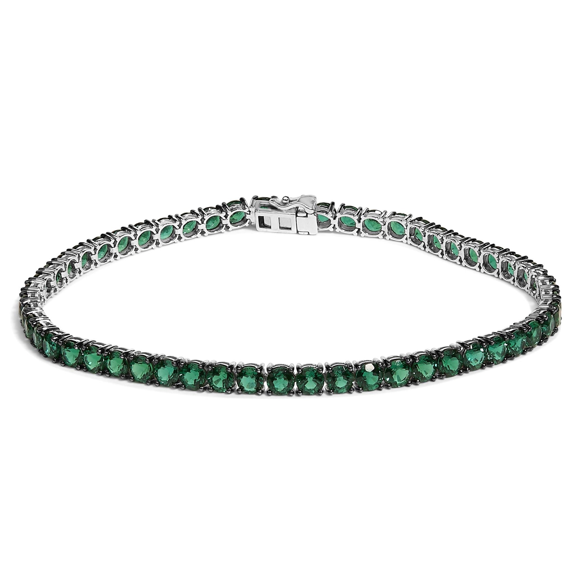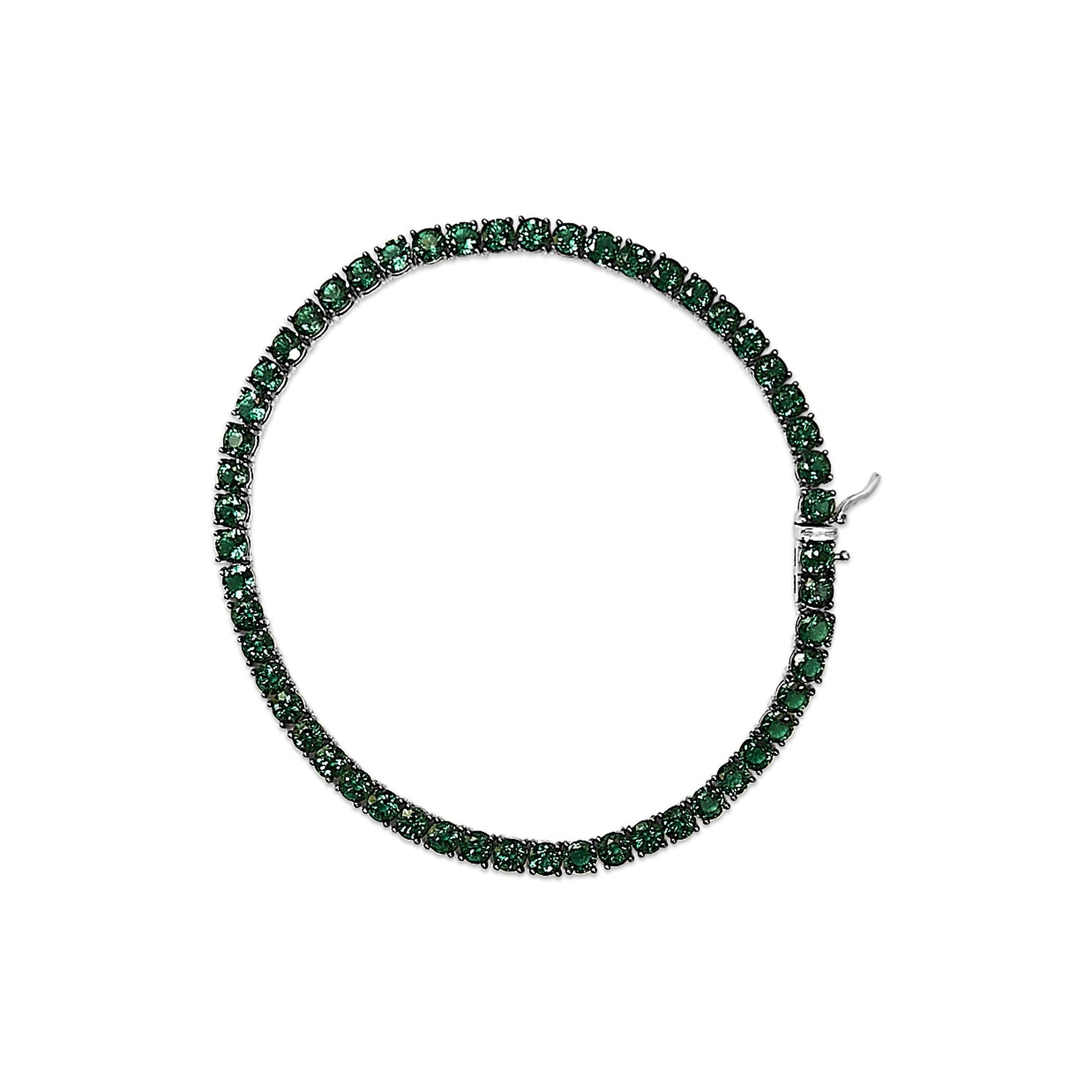 Immerse yourself in the timeless elegance of this .925 sterling silver tennis bracelet, delicately plated in rhodium for a lustrous finish that speaks to the sophistication of its wearer. Made for wrists up to 8.5 inches, this piece captures the essence of classic design with a modern twist, featuring exquisite, lab-created green emeralds. Each 4x4 mm gemstone, treated with oil for enhanced clarity and color, is impeccably set in a 4-prong setting highlighted by striking black rhodium details. This bracelet melds durability, luxury, and conscious creation, making it a perfect choice for those who value ethical elegance and pristine craftsmanship.
