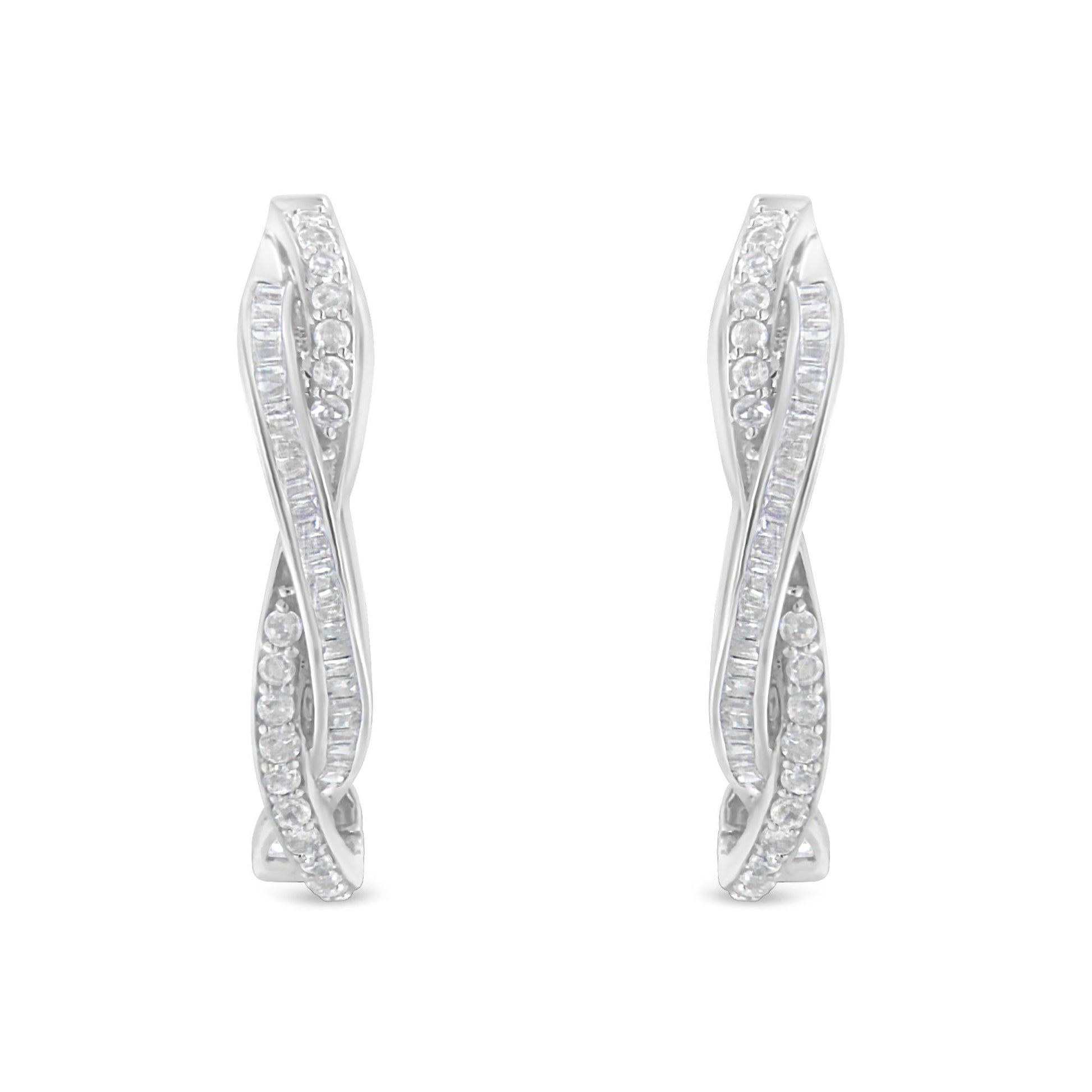 Add some much needed glamour to your outfit with these beautifully unique diamond hoop earrings. Created in a modern design, this piece is created with the finest 0.925 sterling silver and is embellished with 36 round-cut diamonds in a pave setting, and 64 baguette-cut diamonds in a channel setting. The total diamond weight is 0.75 ct, and is the perfect choice for any night out. Comes with lever backs for a secure fit.