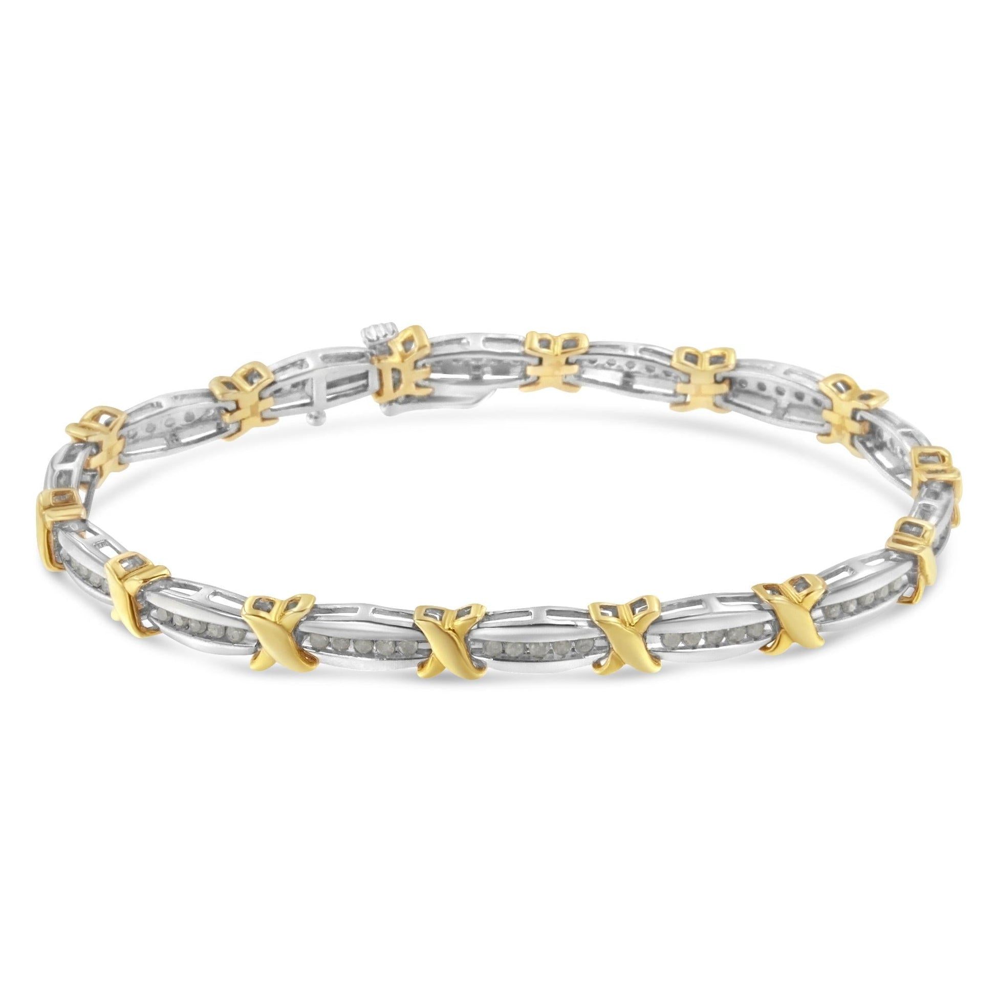 Elegant and timeless, this gorgeous .925 sterling silver tennis bracelet features 1.0 carat total weight of round, rose-cut diamonds channel set into tapered links. These tapered links alternate with X shaped links. The 7†bracelet fastens safely with a box with tongue and security lock clasp. The bracelet comes in two tone 10K yellow gold coated silver with H-I color diamonds and plain silver with I-J color diamonds. This authentic design is crafted of real 92.5% sterling silver that has been electro-coated with genuine rhodium (a platinum-family metal) or 10K yellow gold, ensuring it will keep a tarnish-free shine for years to come. This classic, slender tennis bracelet makes a great gift for any special occasion. Diamonds are thought to give the wearer clarity and illuminate solutions to life’s problems, as well as encouraging abundance, strength, courage, harmony, faithfulness, and commitment. Give her a gift that will perfectly complement her favorite ensemble.