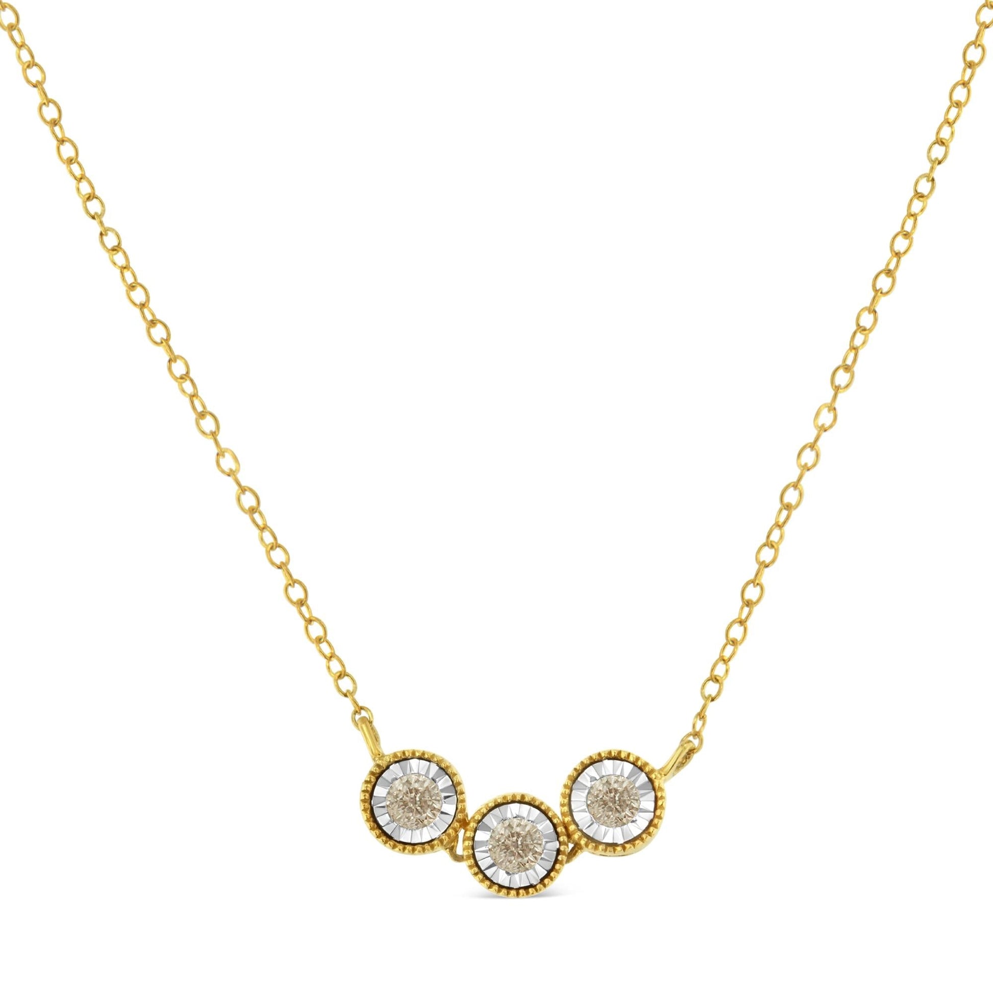 A diamond necklace that features three champagne diamonds set along a thin, delicate chain. The charming design has milgrain beading giving it a vintage touch. It is crafted in two-toned sterling silver and has a total diamond weight of 1/4 carats.